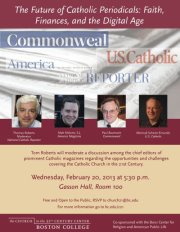 The chief editors of three prominent Catholic magazines will come together Feb. 20 to discuss the opportunities and challenges they face amidst new technologies, polarizing religious discourse, and changing demographics among American Catholics. The panelists will be Matt Malone, S.J., editor-in-chief of America; Commonweal Editor Paul Baumann and Meinrad Sherer-Emunds, executive editor of U.S. Catholic. Tom Roberts of National Catholic Reporter will serve as the moderator. The event, The Future of Catholic Periodicals: Finances, Faith, and the Digital Age, will take place at 5:30 p.m. in Gasson Hall, Room 100. Sponsors: The Church in the 21st Century Center and Boisi Center for Religion and American Public Life.